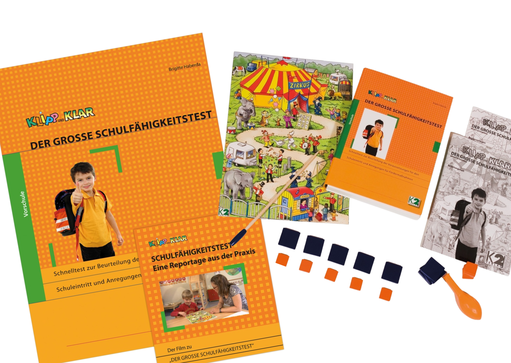 Schulreif? Mit dem KLIPP und KLAR Schulfähigkeitstest finden Sie die Antwort. In 20 Aufgaben werden Teilleistungen überprüft, die für den Schrift-Spracherwerb, das Lesen und für Rechenoperationen im Zahlenraum bis 20 verfügbar sein müssen. Alle Aufgaben sind in ein Spiel eingebettet, in einen Besuch im Zirkus mit Jongleuren und Zauberern, mit Elefanten und Mäusen und mit vielen Gelegenheiten zum Mitmachen.